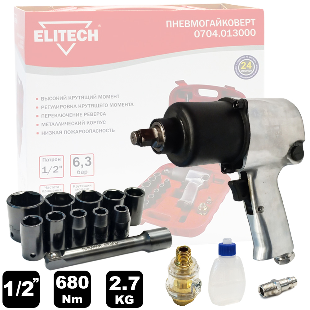 Гайковерт пневматический (6,3 атм / 1/2"_680 Нм / Кейс с набором) (0704.013000), ELITECH 186324