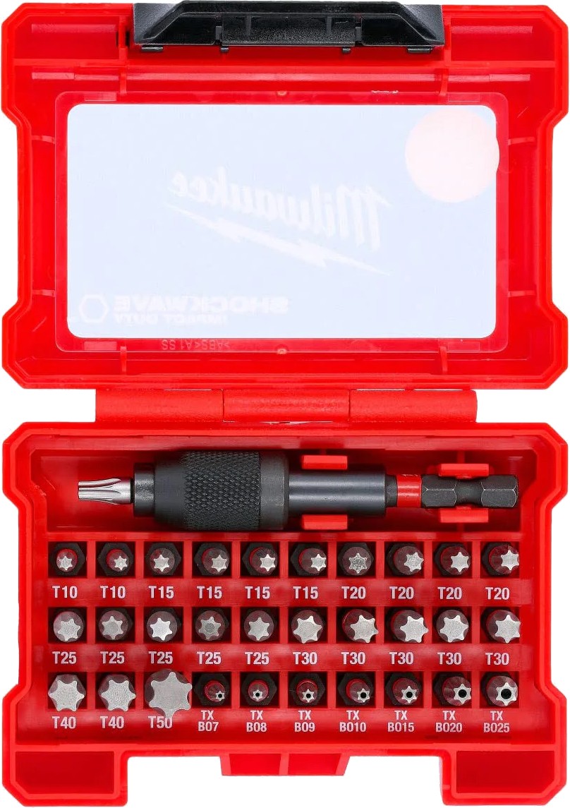 Биты Milwaukee Shockwave 32шт в пластиковом кейсе (4932471586) (TX/TX BO, геометрия Shock Zone, подвержены термообработке, конструкционная сталь, компрессионный кованный наконечник)