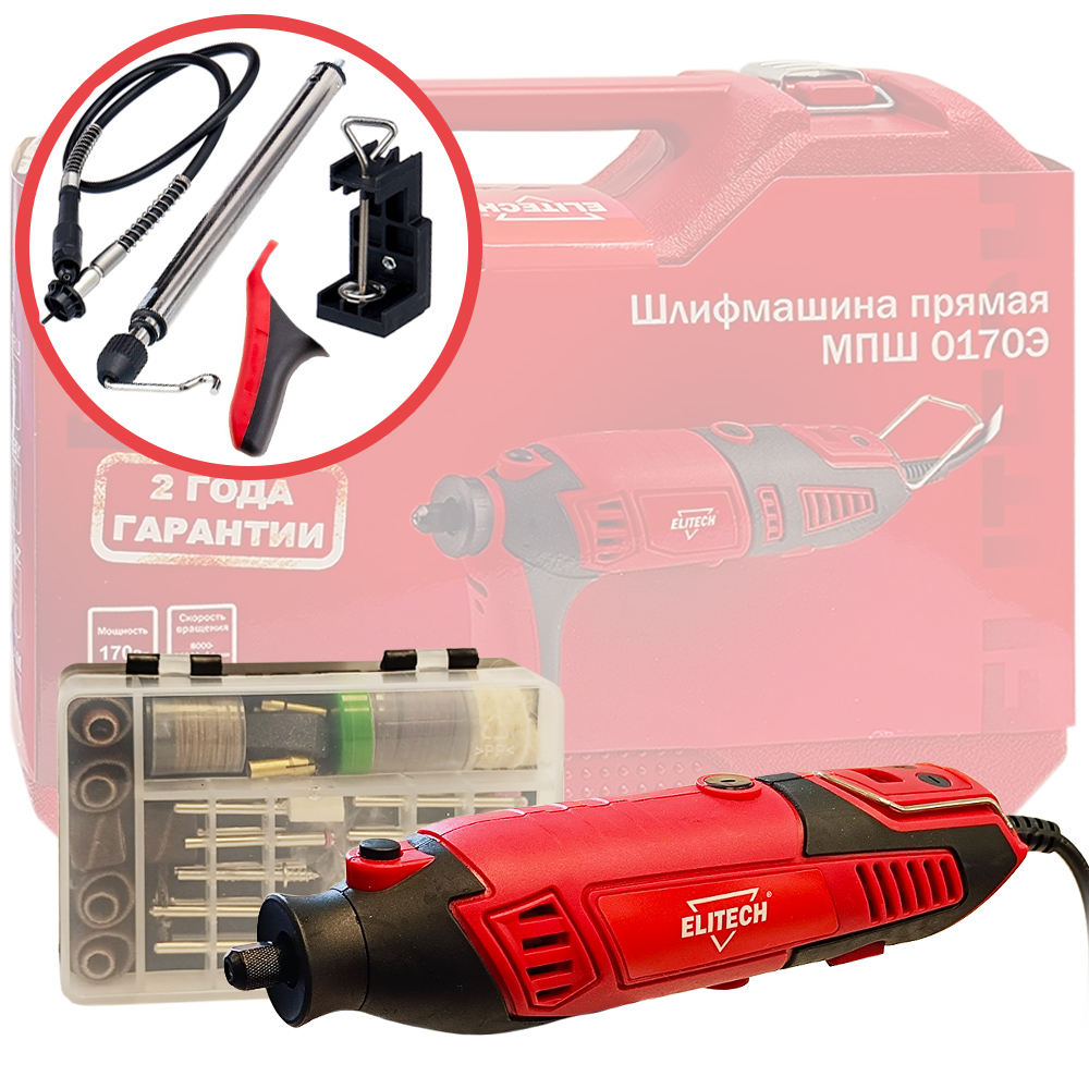 Шлифмашина прямая (гравер) МПШ 0170Э (E2213.039.01) сетевая (170Вт / насадки / Кейс), ELITECH 204511