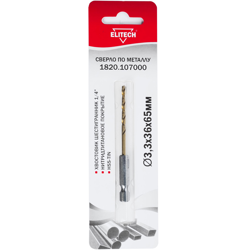 Сверло по металлу HSS-G+TiN HEX 3,3x65 мм (1 шт), ELITECH 193847
