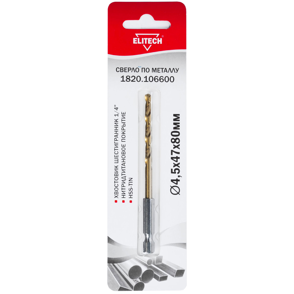 Сверло по металлу HSS-G+TiN HEX 4,5x80 мм (1 шт), ELITECH 193843